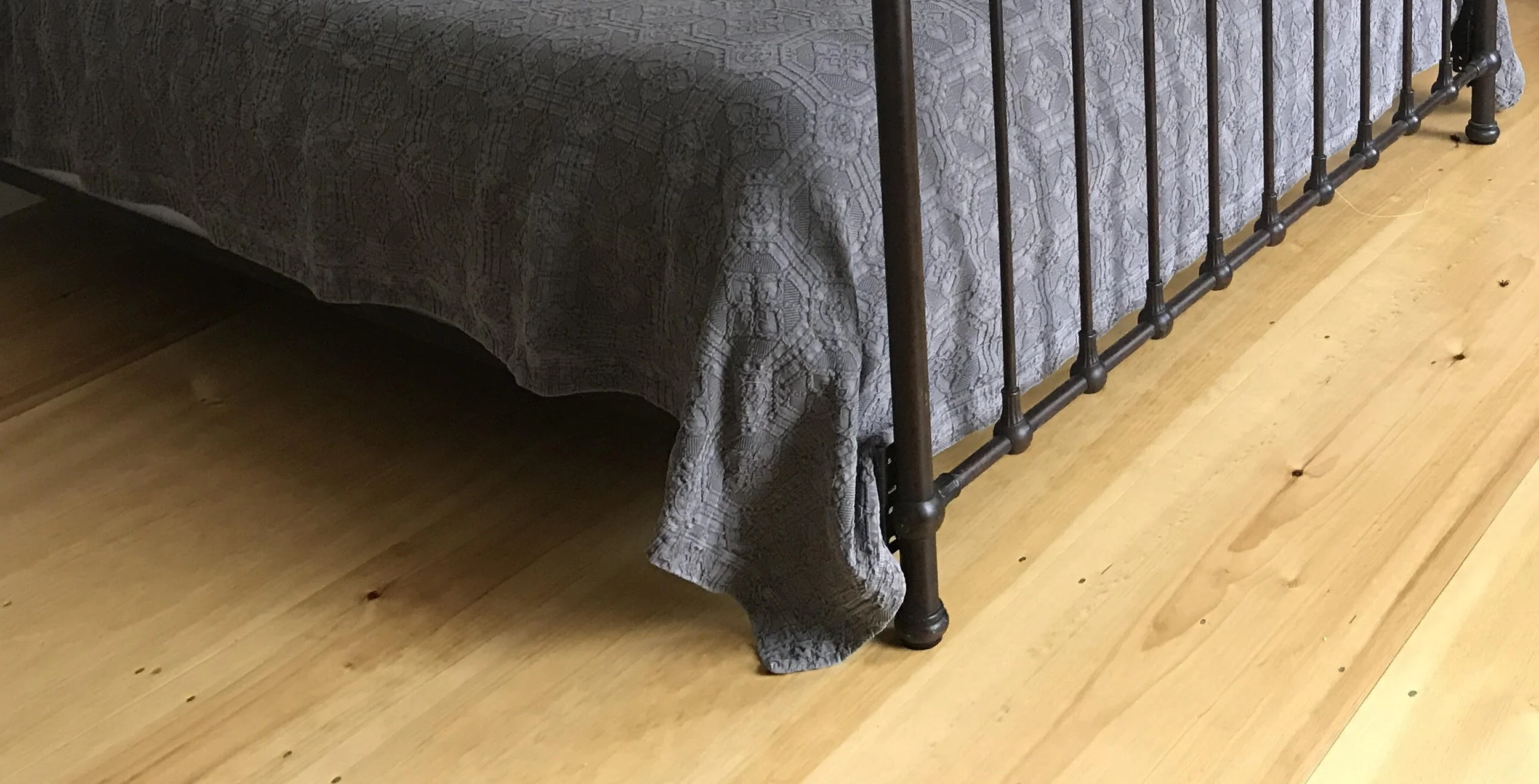 Wide-plank flooring in a bed room Photo courtesy of The Wood Mill of Maine